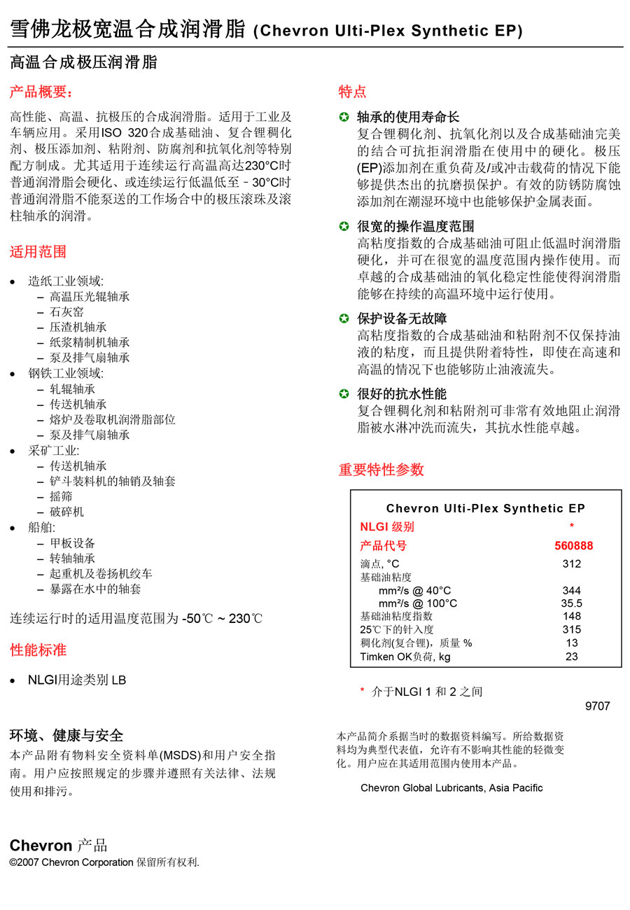 雪佛龙极宽温和合成润滑脂